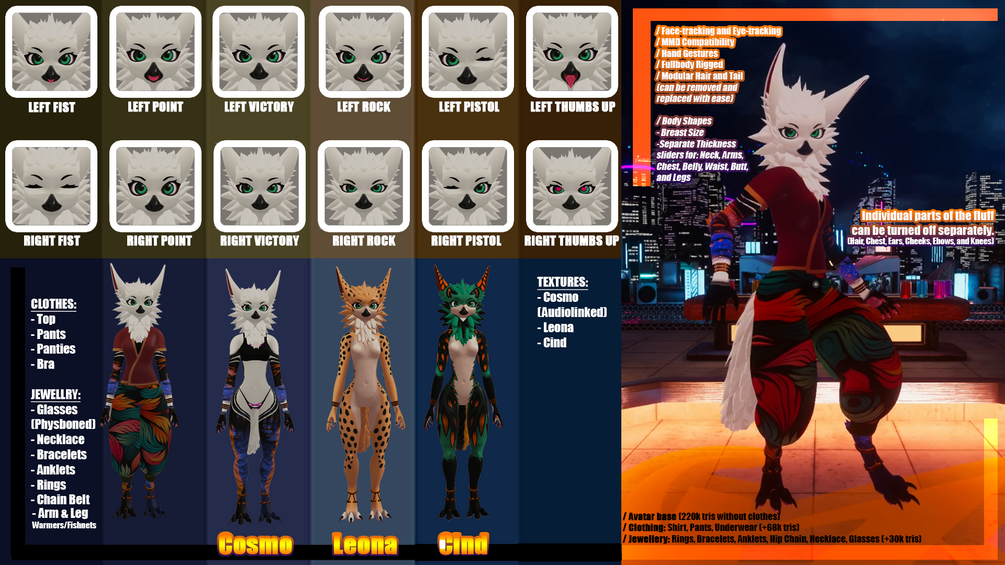 Finally it's here? I've been working on this for a while now, in-between custom commissions. It's a Hybrid Fluffy Bird that comes with 3 Different Textures and lots of features. It has Facetracking (Universal Blendshapes) and it's rigged for Fullbody.